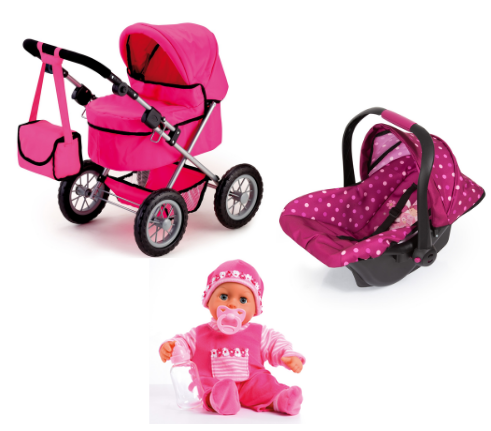 Bayer – Doll First Words Baby + Doll Car Seat + Doll Stroller Trendy - Pink (Bundle)