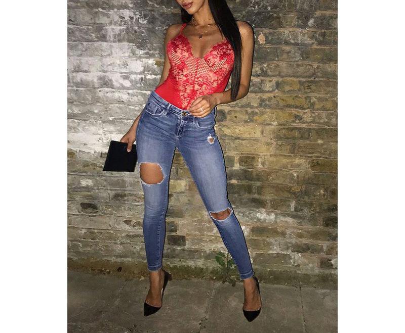 Christina blúndu samfella með hlýrum - Rauð/Nude