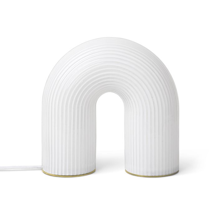 A bold light with a sculptural arc reminiscent of ancient columns, our Vuelta lamp is made from opal glass with a rippled surface that lends textural appeal to the piece. Designed with an LED light source that emits a soft, diffused light, it also features an adjustable dimmer switch for ultimate ambiance control. Use it as a decorative lamp in a dark corner or on a shelf to light up a collection of books.